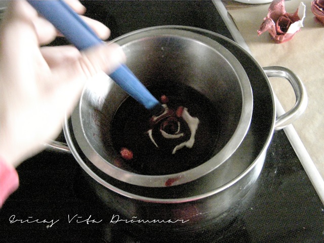 Stearin och stearinfärgämne la jag i vattenbad. Har du en gammal kastrull du ej mera använder vid matlagning , är det ett bättre sätt att smälta stearin. Ljustumpar passar också utmärkt till detta.